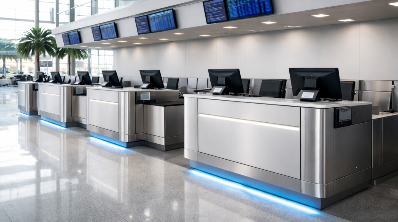 High-end, custom-fabricated metal counters for check-in, immigration, and boarding gates.